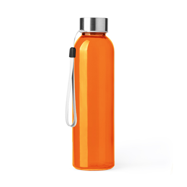 Bottle with glass design, available in a wide variety of colours, with stainless steel screw-on lid and easy to carry, thanks to its strap, in gray.