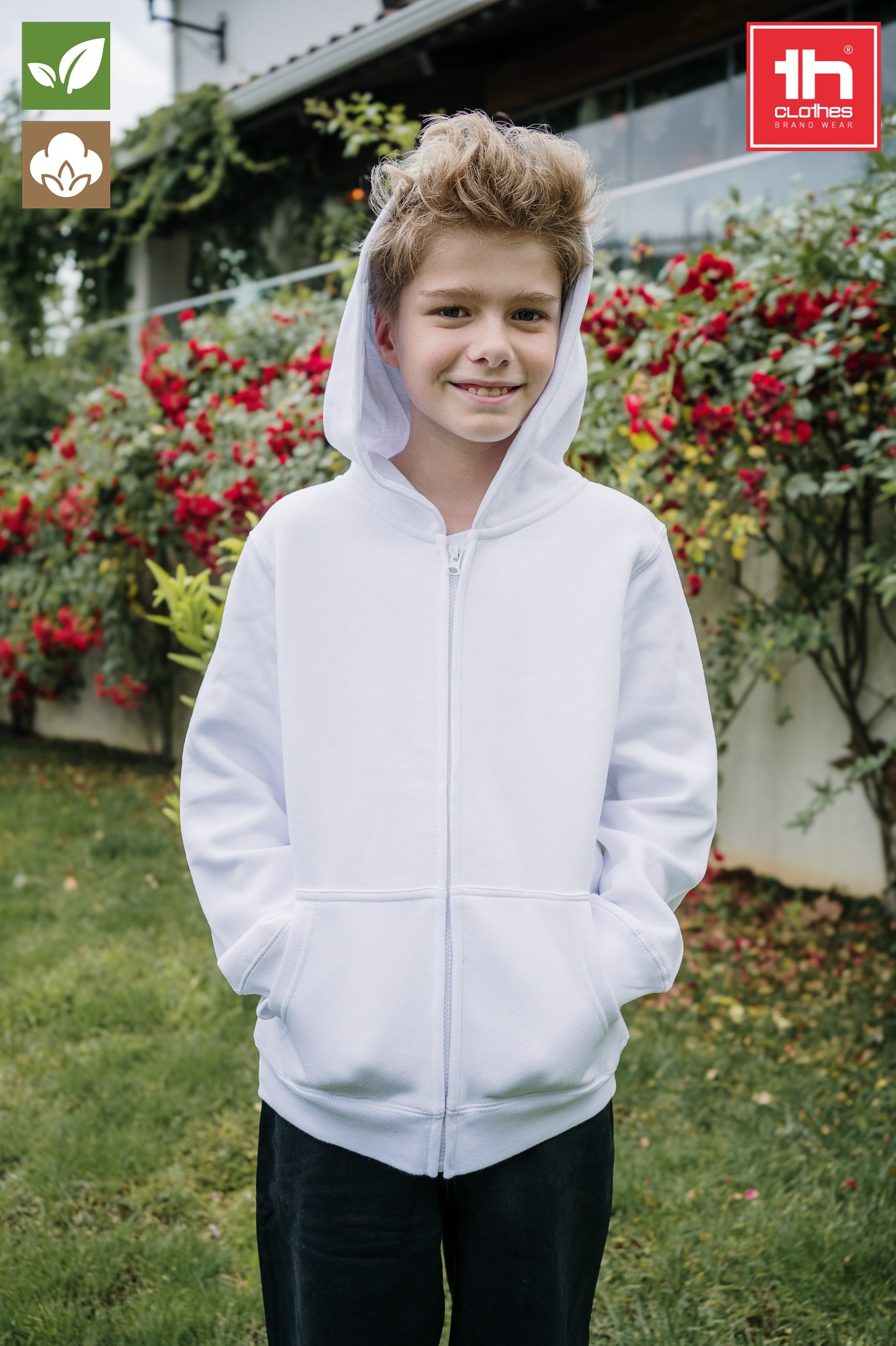 Lined hood with tone on tone drawstring • Carded interior • 2 side pockets • Inserted zipper with slider and handle • Cuffs and bottom of the article in Rib 1×1 • Cut and sewn • Hood according to European Union safety standards • Enzyme treatment