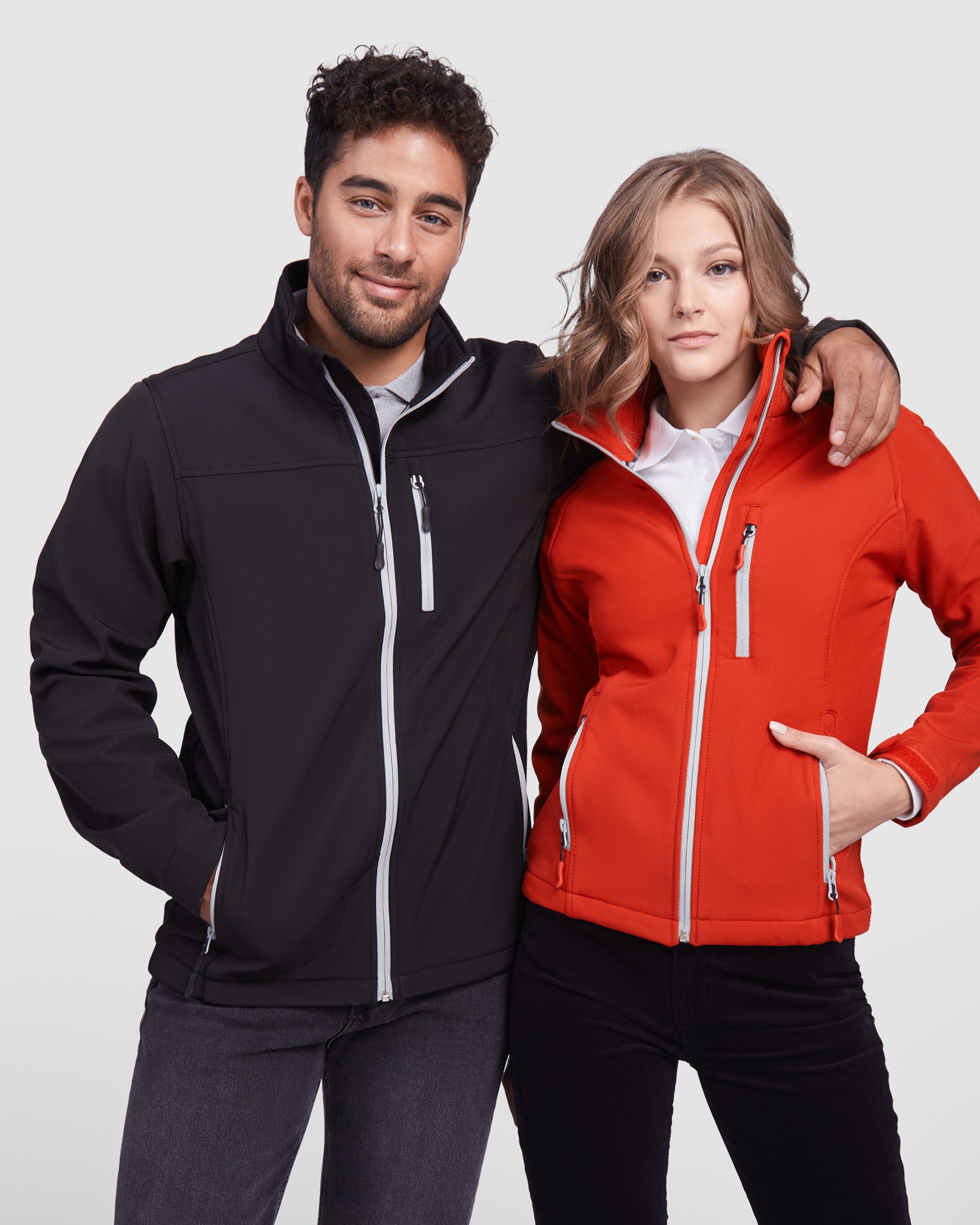 2-layer softshell with inverted sealed-effect zip, with matching chin protector and zipper puller. Three outside pockets with matching zip and puller. Velcro fasteners in cuffs. Bottom hem with elastic drawcord and stoppers.