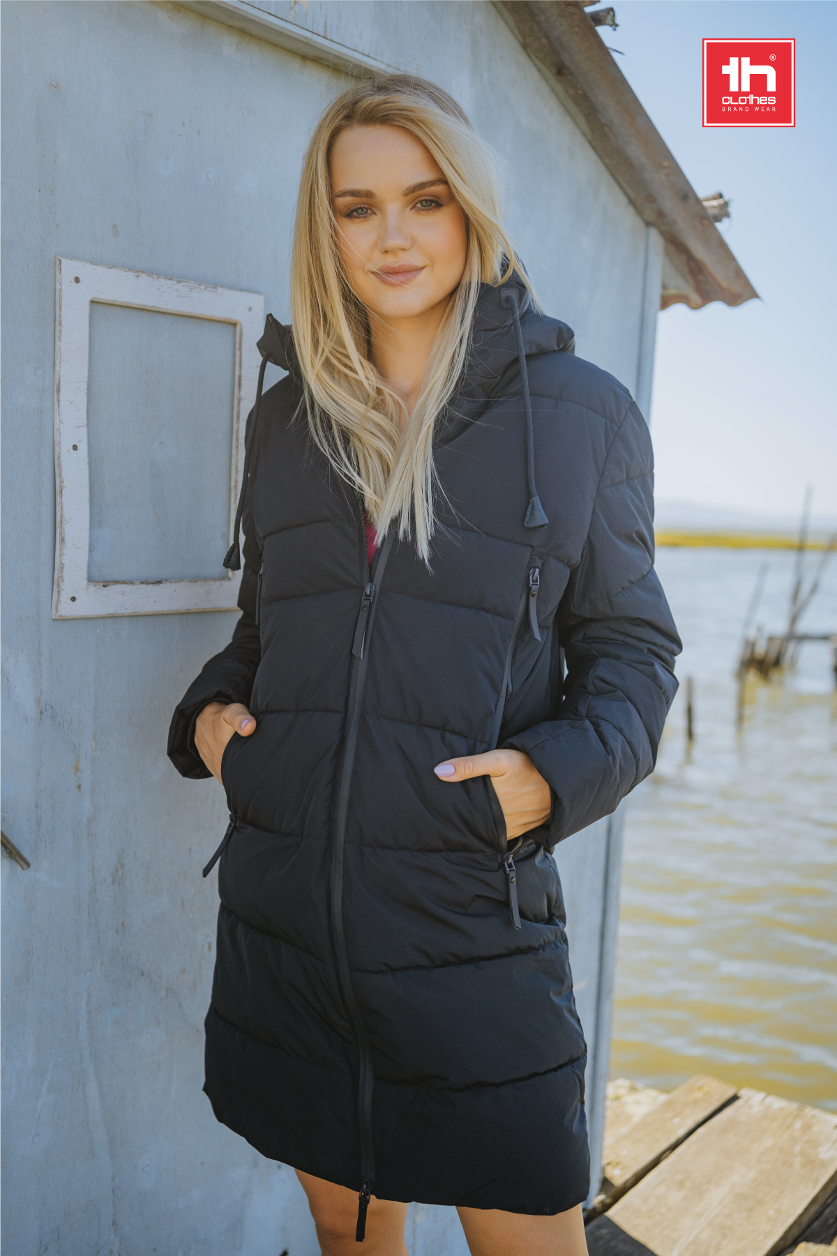 Waterproof zippers • Elasticated cuffs • Decorative topstitches • Lined and padded hood • 4 front pockets with zippers and one interior pocket