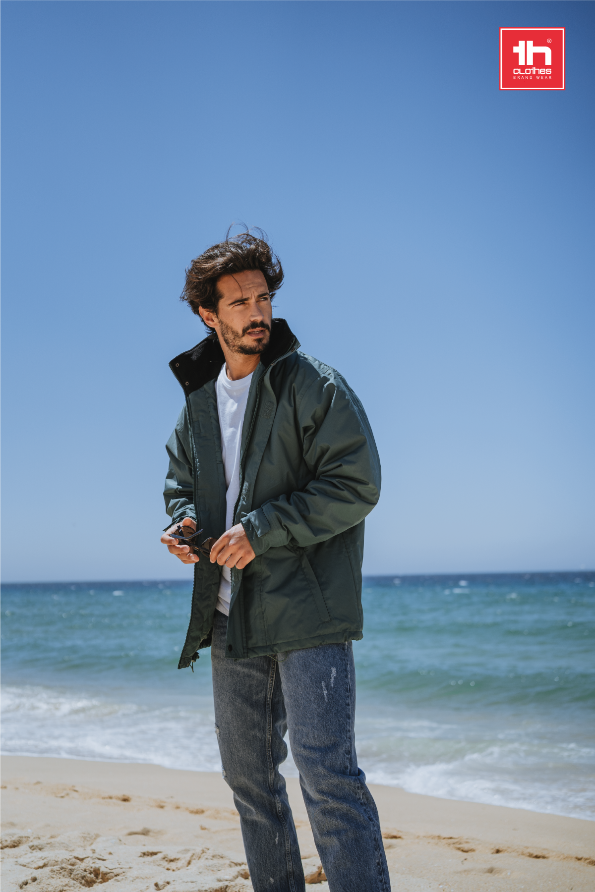 Exterior: 100 % polyester pongee 240 and waterproof PVC coating • Interior: 100 % taffeta polyester • Wadding: 100 % polyester • Black fleece lined collar which closes with a Velcro strip • Fold away hood in the collar, adjustable with tone on tone tightening drawstrings with stoppers • Front opening with flap, tone on tone zipper, Velcro and black snap buttons • 2 outside pockets with flap • 2 interior pockets (1 for mobile phone), with Velcro closure • 2×2 rib knit interior cuffs • Adjustable outer cuffs with velcro straps • Interior customization zip at lower back • Heat-sealed seams • YKK ® tone on tone zipper opening • Modern cut