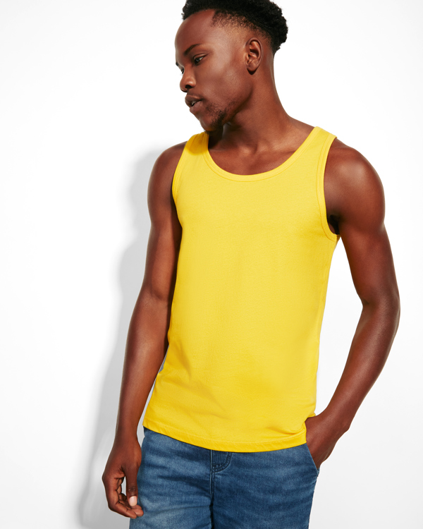 Slim-fit tank top with ribbed single jersey in collar and armhole. 4-thread overlocked side seams for greater durability.
