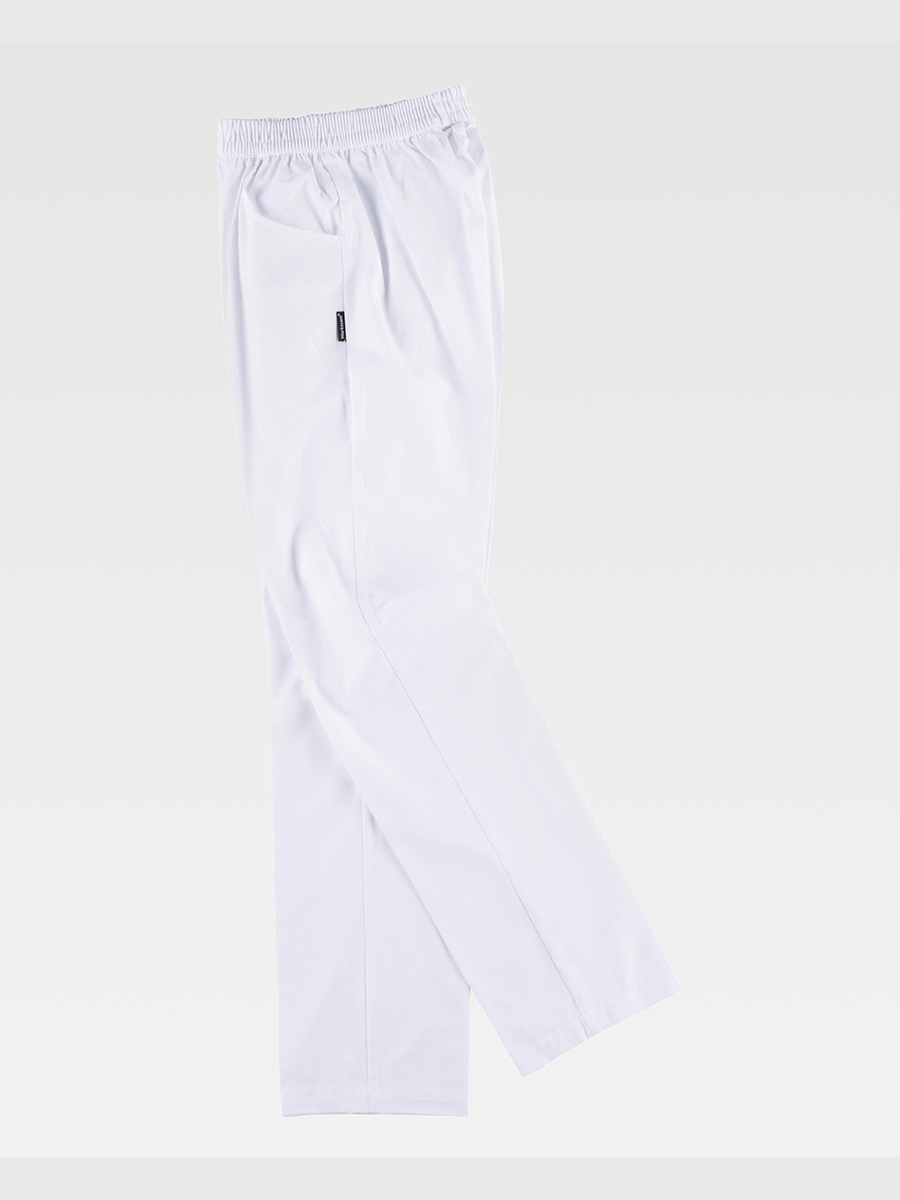 Unisex straight bottom trousers with elasticated waist without flap. Two side pockets with rounded opening