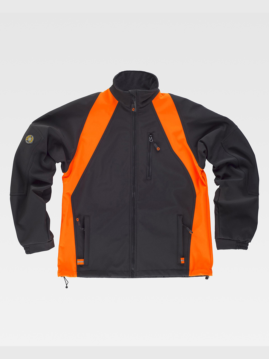 Workshell jacket with nylon zip, high collar, elasticated cuffs – One chest pocket and two internal side pockets with zip – Reinforcements on the elbows, adjustable waist